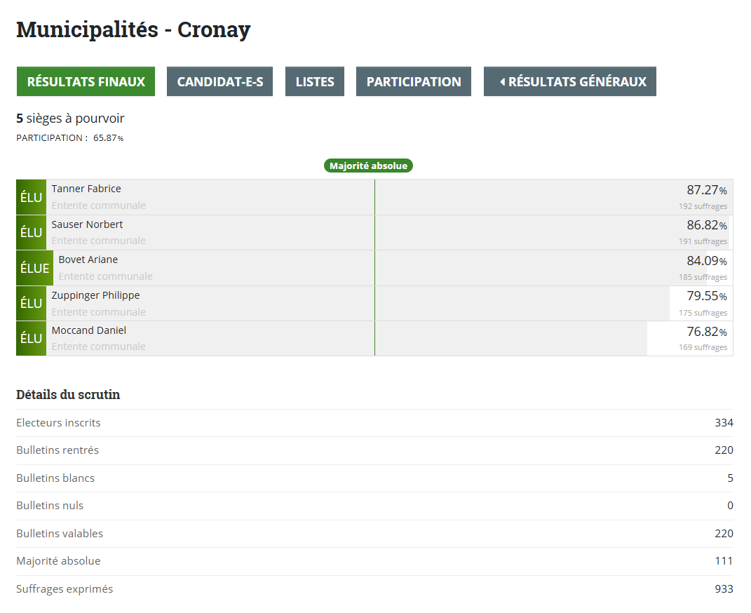 Elections 2026 | résultats de l'élection à la municipalité de Cronay
